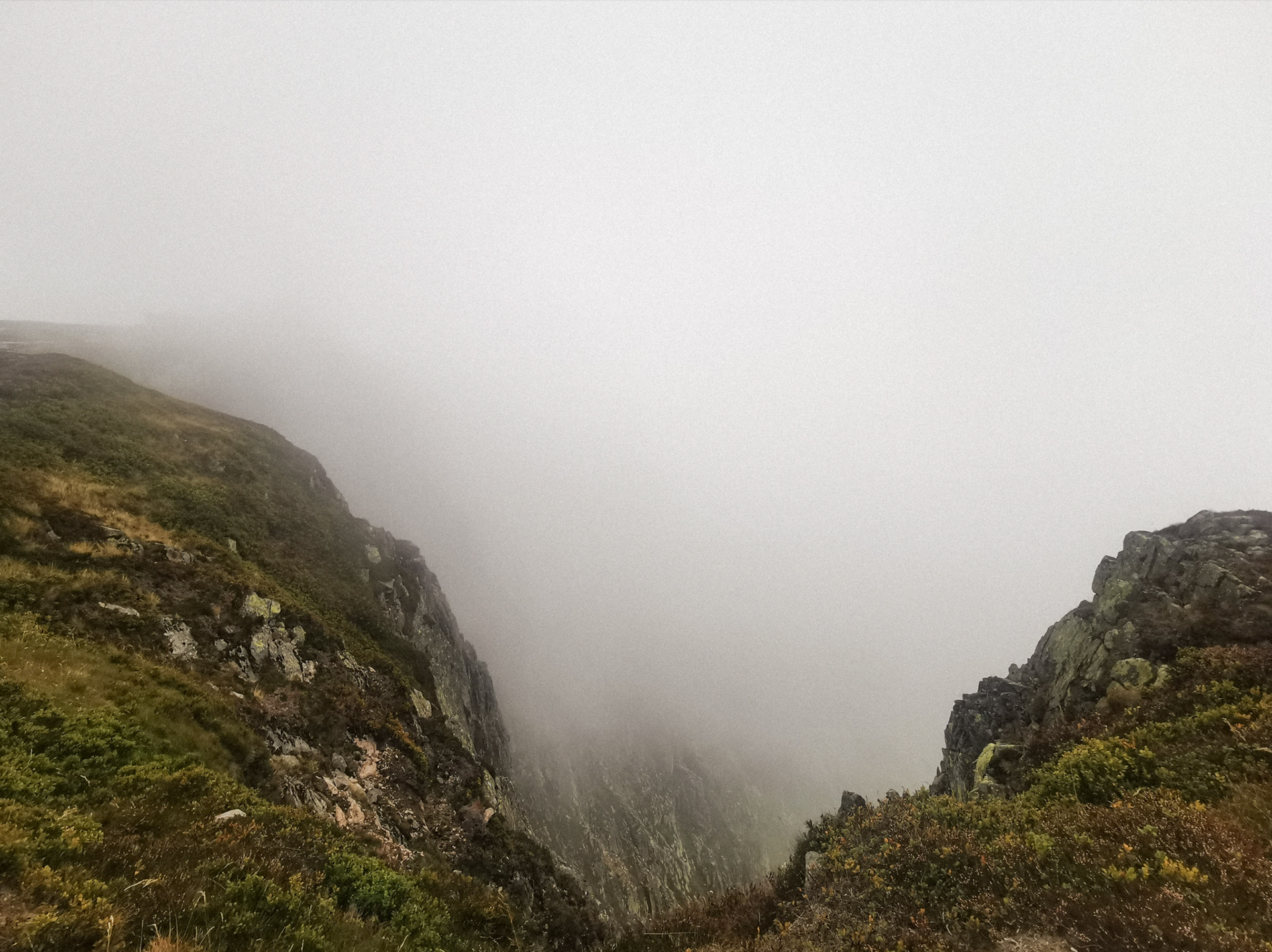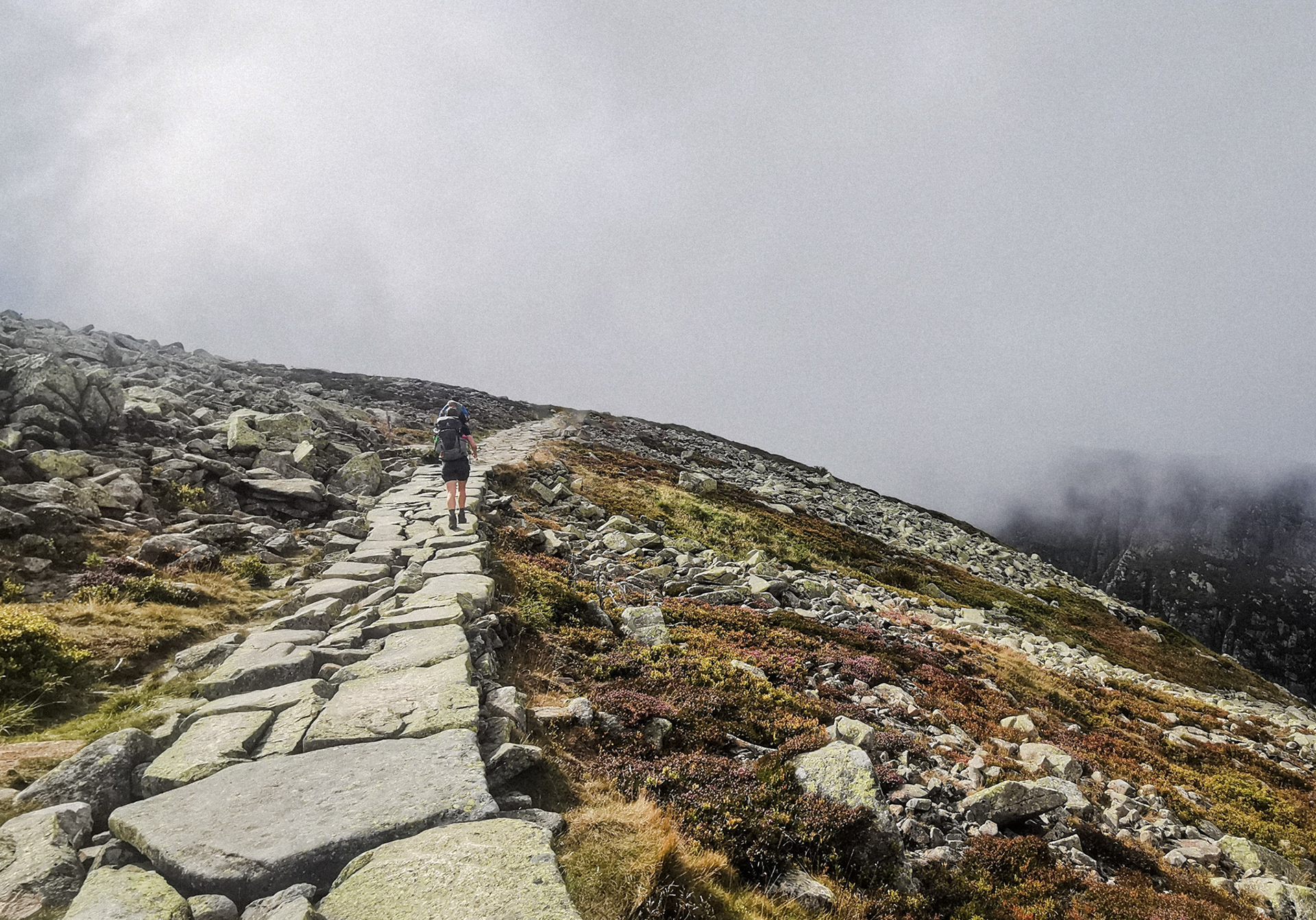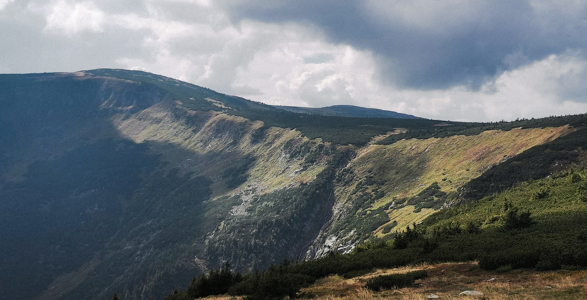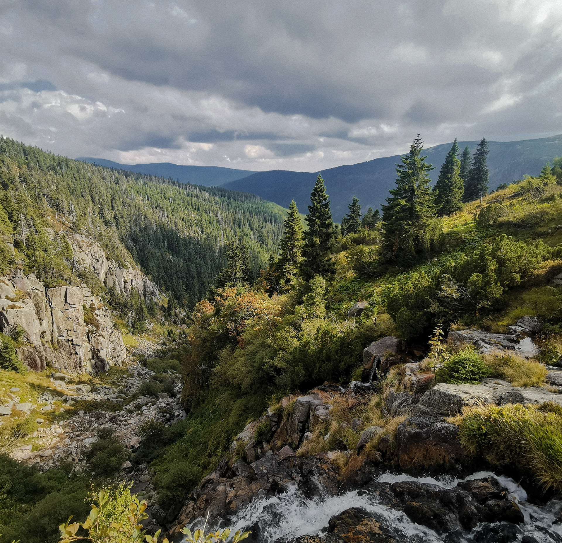 Die erste Wanderung begann ich zögerlich. Zum einen fühlte ich mich seit einigen Tagen erkältet, zum anderen war mir das Riesengebirge völlig unbekannt, weshalb ich mir erstmal einen Überblick verschaffen musste – praktisch ein Warm Up. Wie zukünftig jede Wanderung startete ich auch heute im nahegelegenen Spindlermühle, ein überschaubarer Ort, der sich dicht an die Berge schmiegte. Nachdem ich die Stadt hinter mir gelassen und die ersten 1000 Höhenmeter erklommen hatte, war ich plötzlich mittendrin in einer der beeindruckendsten Landschaften Mitteleuropas. Steile Anstiege im alpinen Profil, Geröllfelder, tiefe Wälder, Hochebenen jenseits der Baumgrenze, Moore, Wasserfälle – in kürzester Zeit offenbarte sich mir die tschechische Landschaft in einer Vielfältigkeit, wie ich sie selten zu sehen bekam. Spätestens an dieser Stelle waren alle Bedenken über Bord geworfen und aus einer ursprünglich kleinen Tour wurde ein 27 Kilometer langer Gebirgsmarsch. Mein Entdeckerherz schlug definitiv höher.